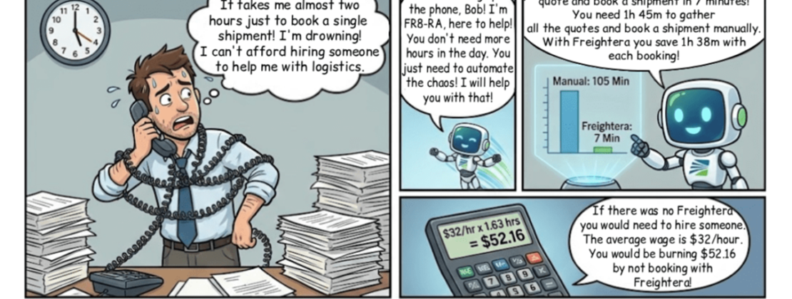 Hello dear viewers! We’re happy to present our newest comic! Today’s adventure follows Bob, who encounters many common issues on the freight shipping journey. But he also discovers a friend in FR8-RA who, using the power of basic math, shows Bob how much he can save simply by using Freightera!