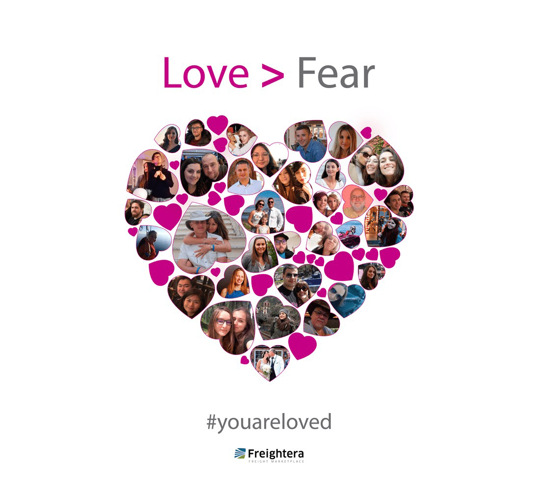 2. Earlier this week, our amazing graphic artist Ksenia surprised everyone by creating the Heart of Freightera, a card consisting of our photos that she collected from our Slack channels and Playbook. We worked together on the message in it. Love More than Fear & You are Loved.